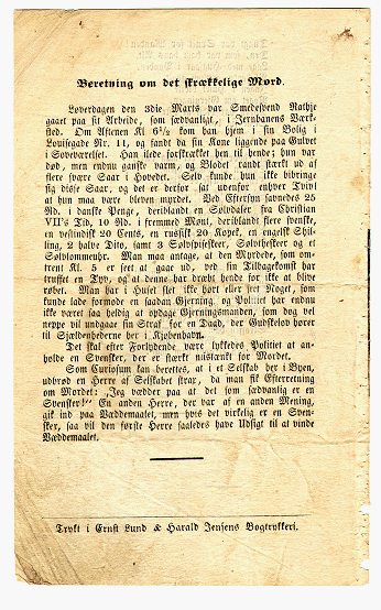 Konen, der i Løverdags den 2den Marts blev myrdet i sin Stue paa Nørrebro |